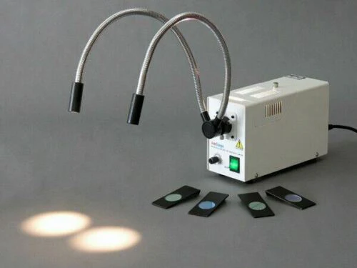 This microscope illuminator light source control box offers 150 Watt halogen lighting, providing strong, even and cool daylight illumination. The light source comes with a built-in heat filter for cool light, a specially designed slot for color filters, and solid state controls for full adjustment of intensity. Its top window design is convenient for changing bulbs. Its auto-shut-off mechanism will cut off electricity automatically when the window is open. The light source comes with a two-step mounting adapter with 5/8″ (16mm) and 25/32″ (20mm) inside diameters for attaching fiber optic light cable, either gooseneck or ring. This cool high intensity lighting system is excellent for biological and electronic applications. This un