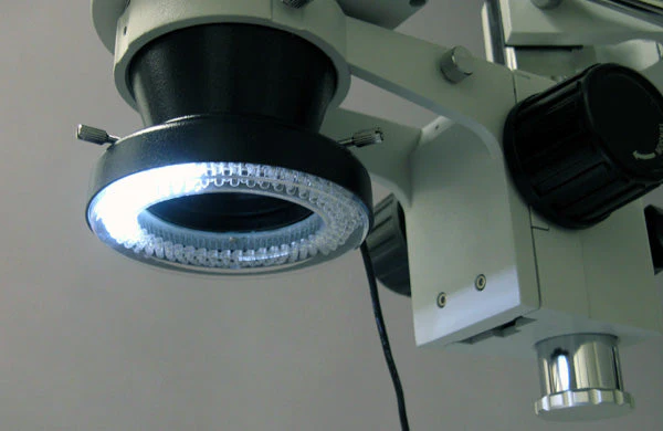 This is a 144-LED intensity direction adjustable ring light with mounting size up to 2-2/5″ (61mm) in diameter. The light ring is consisted of 4 individual portions (4 lighting zones) that can be turned on/off separately. You may use the feature to change lighting directions and obtain the best illumination for your application. The ring light has 2-2/5″ (61mm) inside and 4″ (100mm) outside diameters. It works with power supplies from a 110-220V and comes with a 1-7/8″ (48 mm in diameter) ring adapter. With variable intensity control, it provides cool, even, intense and focused shadow-free illumination. It is an ideal durable cool light source for all stereo microscopes, especially for gemological, coin and gem/jewelry microscopes. This kit comes with one year warranty against manufacturing defects.