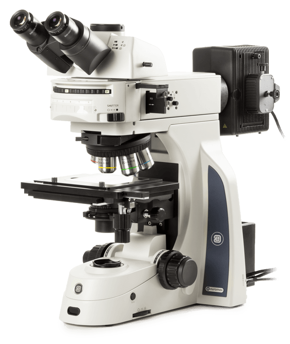 Reflected: 100 W halogen Köhler illumination with internal 100-240V power supply. Equipped with field and aperture diaphragms, filter slots, polarizer, and analyzer. A rotating cassette allows for quick switching between darkfield and brightfield.
